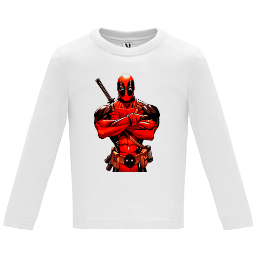 Esta camiseta con el diseño Dead Pool está disponible en los colores: blanco, negro, rojo, azul y rosa. Disponible en talla infantil de 2 a 12 años.