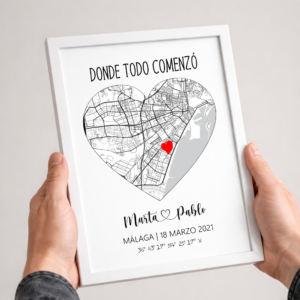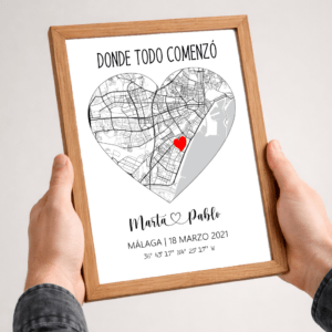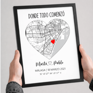 Escribe la ciudad, pueblo …(para que hagamos el diseño de la vista aérea del mapa) y la calle o lugar exacto para colocar el corazón en esa ubicación exacta.