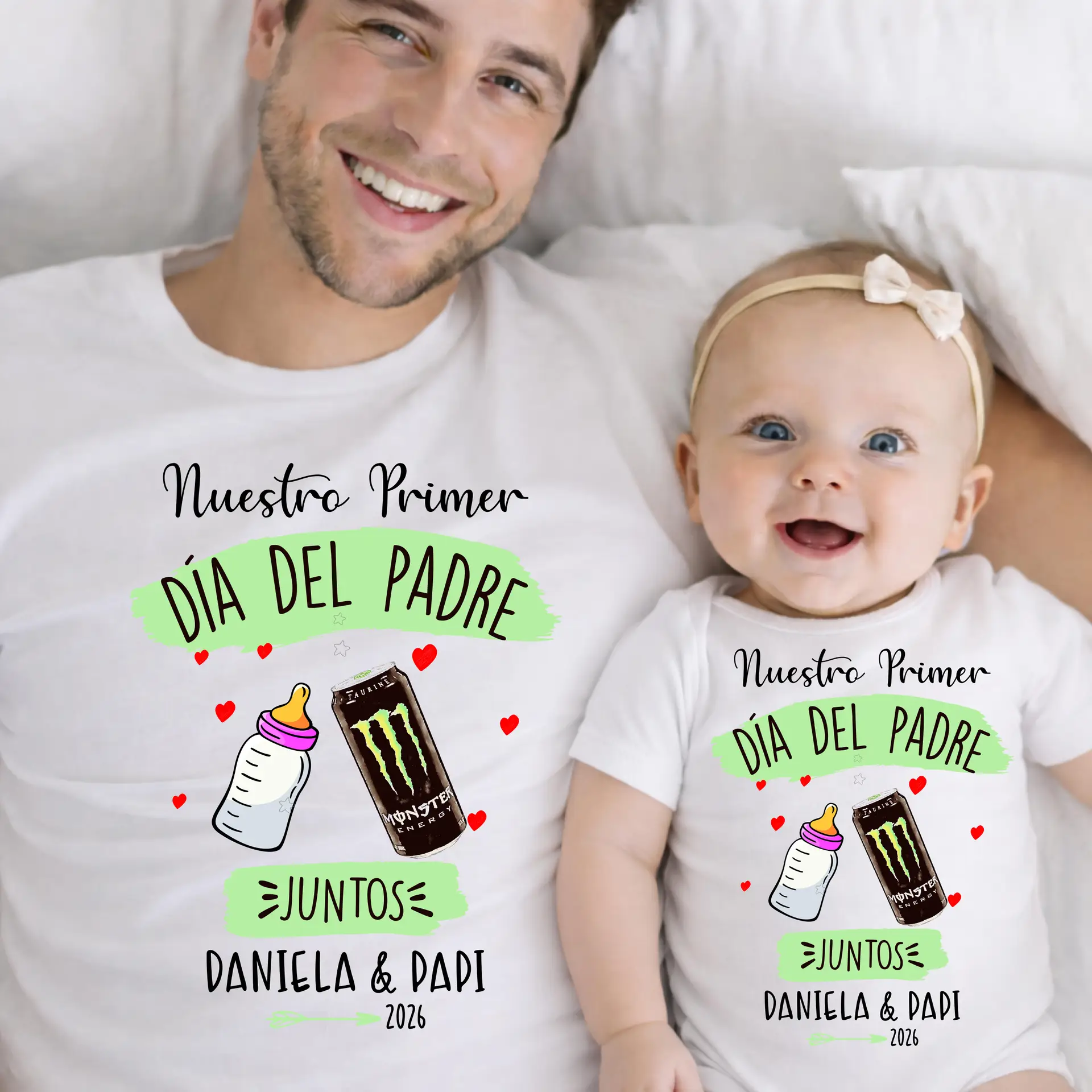 El primer año como papá tiene algo mágico: días largos, noches cortas, un cansancio que solo se compensa con una sonrisa del bebé… y mucho, mucho amor. Este pack de camiseta + body captura ese momento tan único con un diseño divertido y lleno de complicidad: el biberón del peque y la lata de Monster de papá, brindando juntos por esta nueva aventura. 💚