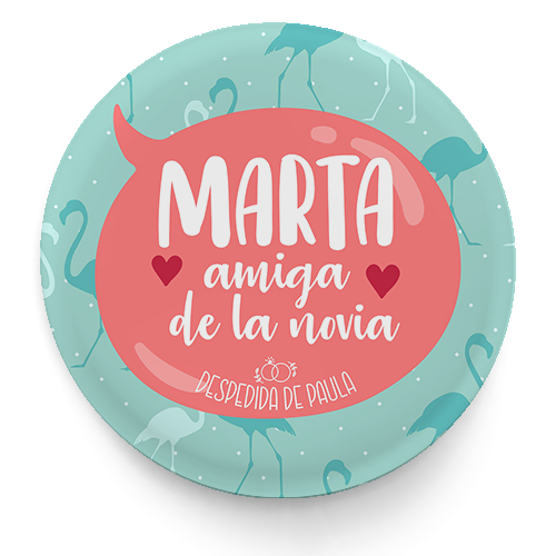 Pack de 10 chapas para despedida de soltera, una con el diseño «mi despedida» y nueve diferentes con los nombres y el parentesco de las invitadas. Puedes personalizar con el nombre y la fecha
